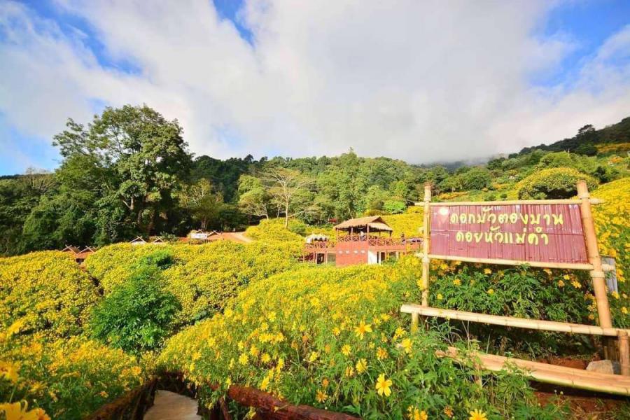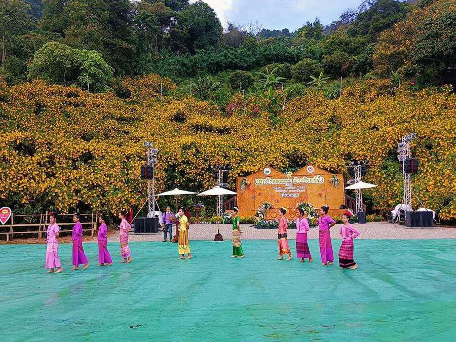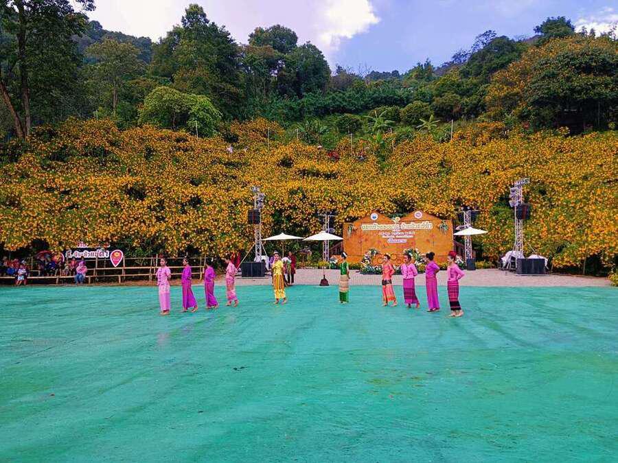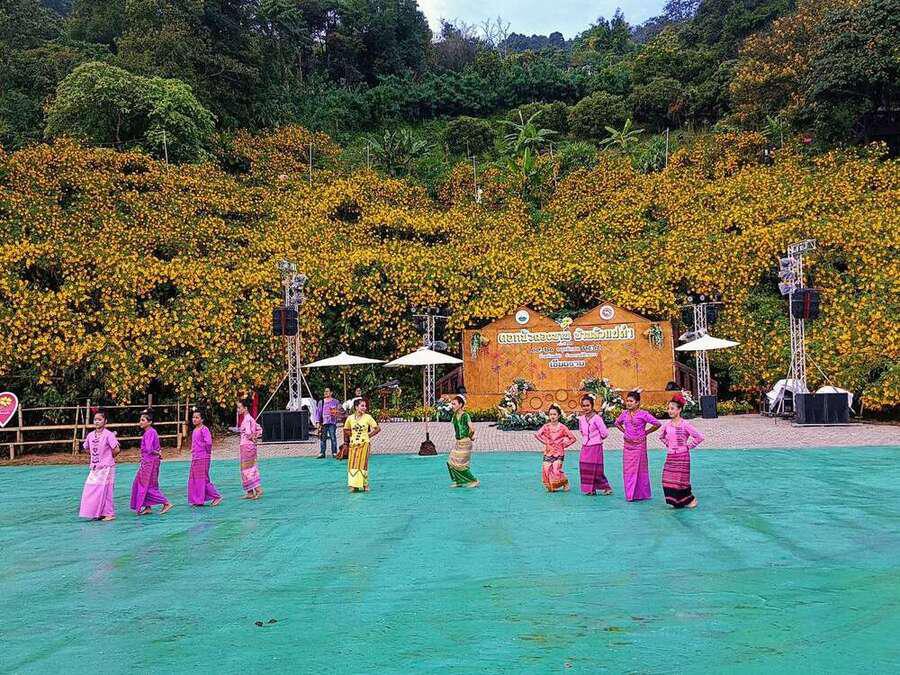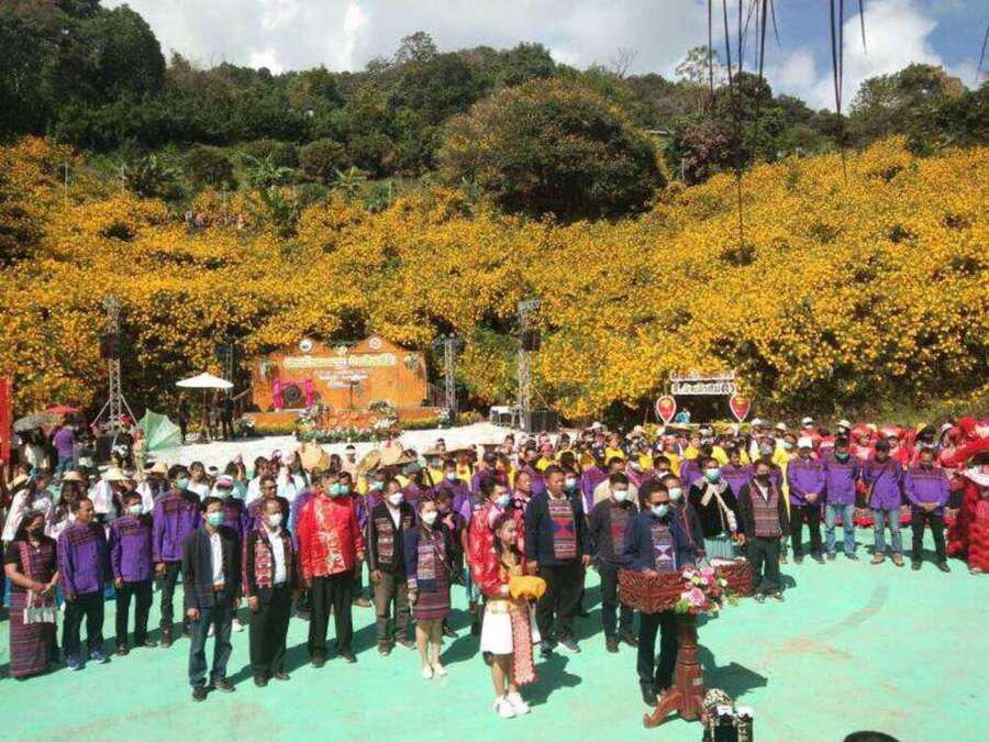 นักเรียนเข้าร่วม พิธีเปิดงานดอกบัวตองบานที่บ้านหัวแม่คำ ปี 2565