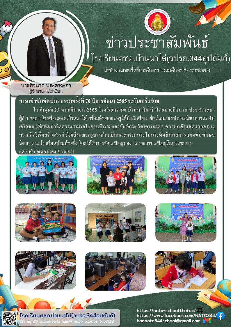 ในวันพุธที่ 23 พฤศจิกายน 2565 โรงเรียนตชด.บ้านนาโต่ นำโดยนายศิวนาถ ประสาวะถา ผู้อำนวยการโรงเรียนตชด.บ้านนาโต่ พร้อมด้วยคณะครูได้นำนักเรียน เข้าร่วมแข่งทักษะวิชาการระดับเครือข่าย เพื่อพัฒนาขีดความสามรถในการเข้าร่วมแข่งขันทักษะวิชาการต่าง ๆ ความกล้าแสดงออกทางความคิดริเริ่มสร้างสรรค์ ร่วมถึงคณะครูบางส่วนเป็นคณะกรรมการในการตัดสินผลการแข่งขันทักษะวิชาการ ณ โรงเรียนบ้านห้วยผึ้ง โดยได้รับรางวัล เหรียญทอง 15 รายการ เหรียญเงิน 2 รายการ