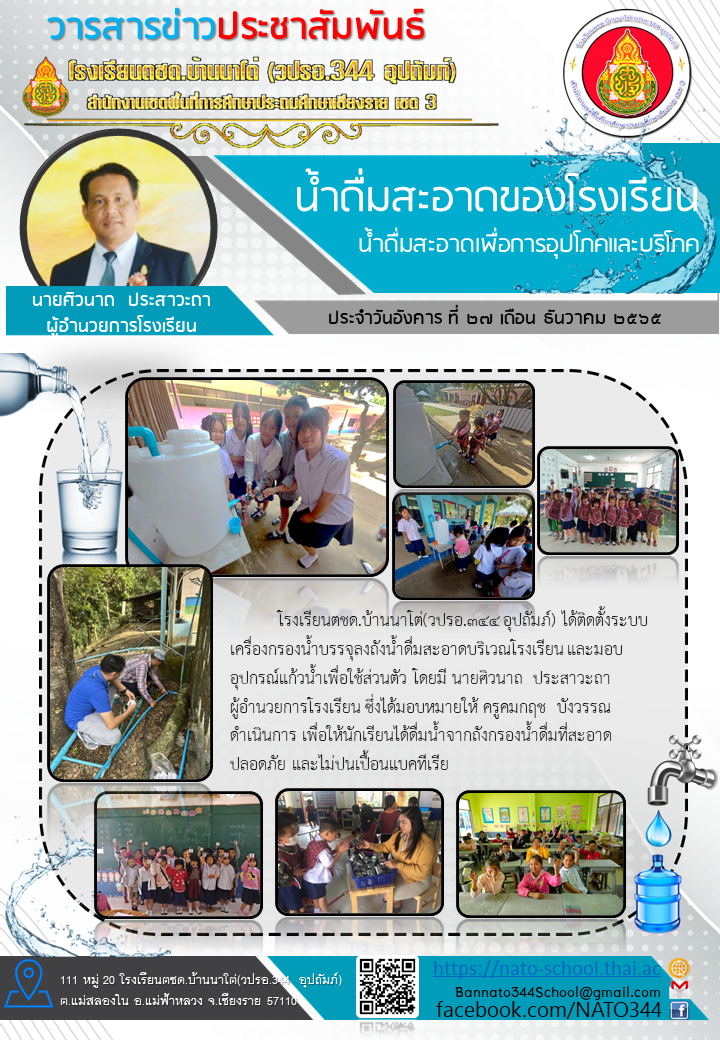 โรงเรียนตชด.บ้านนาโต่(วปรอ.344 อุปถัมภ์) ได้ติดตั้งระบบเครื่องกรองน้ำบรรจุลงถังน้ำดื่มสะอาดบริเวณโรงเรียน และมอบอุปกรณ์แก้วน้ำเพื่อใช้ส่วนตัว โดยมี นายศิวนาถ ประสาวะถา ผู้อำนวยการโรงเรียน ซึ่งได้มอบหมายให้ ครูคมกฤช บังวรรณ ดำเนินการ เพื่อให้นักเรียนได้ดื่มน้ำจากถังกรองน้ำดื่มที่สะอาดปลอดภัย และไม่ปนเปื้อนแบคทีเรีย