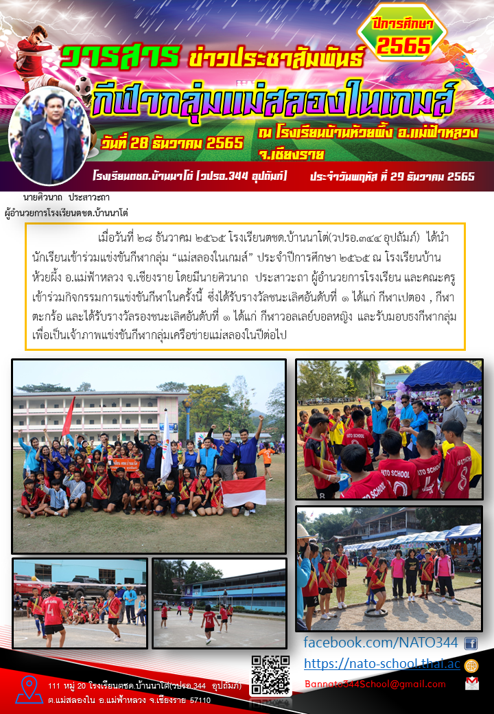 เมื่อวันที่ 28 ธันวาคม 2565 โรงเรียนตชด.บ้านนาโต่(วปรอ.344 อุปถัมภ์) ได้นำนักเรียนเข้าร่วมแข่งขันกีฬากลุ่ม “แม่สลองในเกมส์” ประจำปีการศึกษา 2565 ณ โรงเรียนบ้านห้วยผึ้ง อ.แม่ฟ้าหลวง จ.เชียงราย โดยมีนายศิวนาถ ประสาวะถา ผู้อำนวยการโรงเรียน และคณะครูเข้าร่วมกิจกรรมการแข่งขันกีฬาในครั้งนี้ ซึ่งได้รับรางวัลชนะเลิศอันดับที่ 1 ได้แก่ กีฬาเปตอง , กีฬาตะกร้อ และได้รับรางวัลรองชนะเลิศอันดับที่ 1 ได้แก่ กีฬาวอลเลย์บอลหญิง และรับมอบธงกีฬากลุ่มเพื่อเป็นเจ้าภาพแข่งขันกีฬากลุ่มเครือข่ายแม่สลองในปีต่อไป