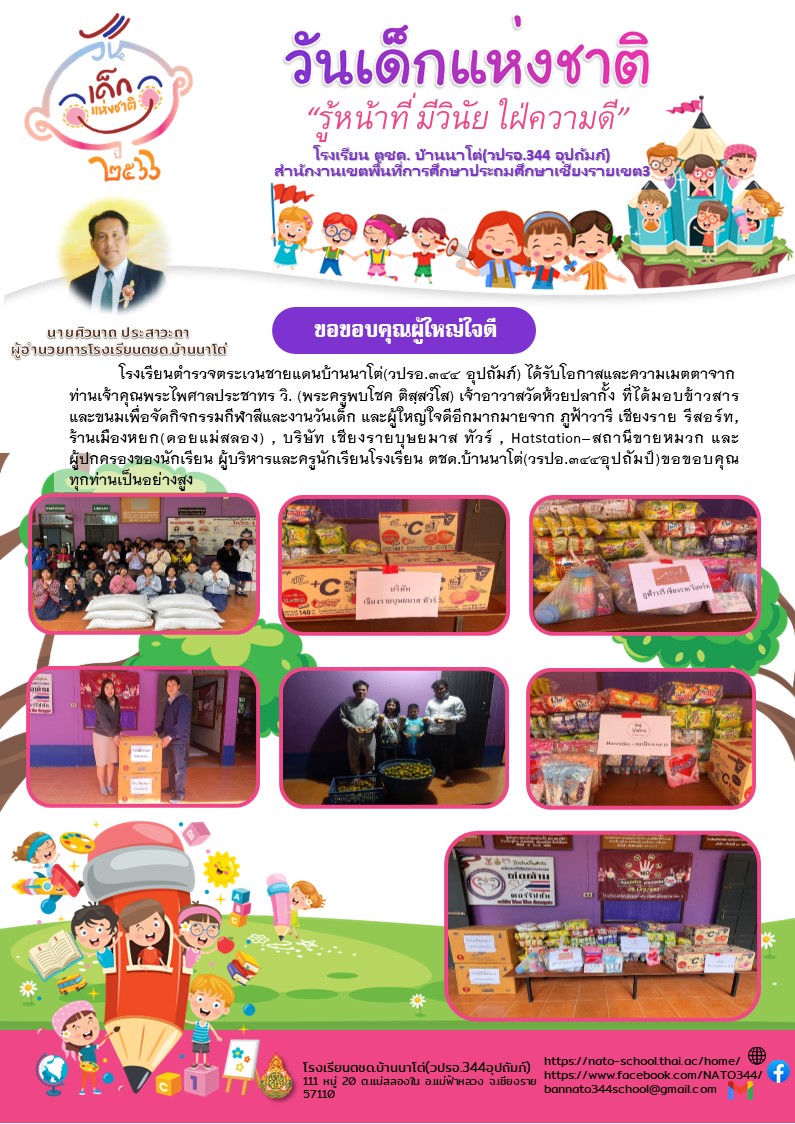 ท่านเจ้าคุณพระไพศาลประชาทร วิ. (พระครูพบโชค ติสฺสวํโส) เจ้าอาวาสวัดห้วยปลากั้ง ที่ได้มอบข้าวสารและขนมเพื่อจัดกิจกรรมกีฬาสีและงานวันเด็ก และผู้ใหญ่ใจดีอีกมากมายจาก ภูฟ้าวารี เชียงราย รีสอร์ท,ร้านเมืองหยก(ดอยแม่สลอง) , บริษัท เชียงรายบุษยมาส ทัวร์ , Hatstation–สถานีขายหมวก และผู้ปกครองของนักเรียน ผู้บริหารและครูนักเรียนโรงเรียน ตชด.บ้านนาโต่(วรปอ.344อุปถัมป์)ขอขอบคุณทุกท่านเป็นอย่างสูง
