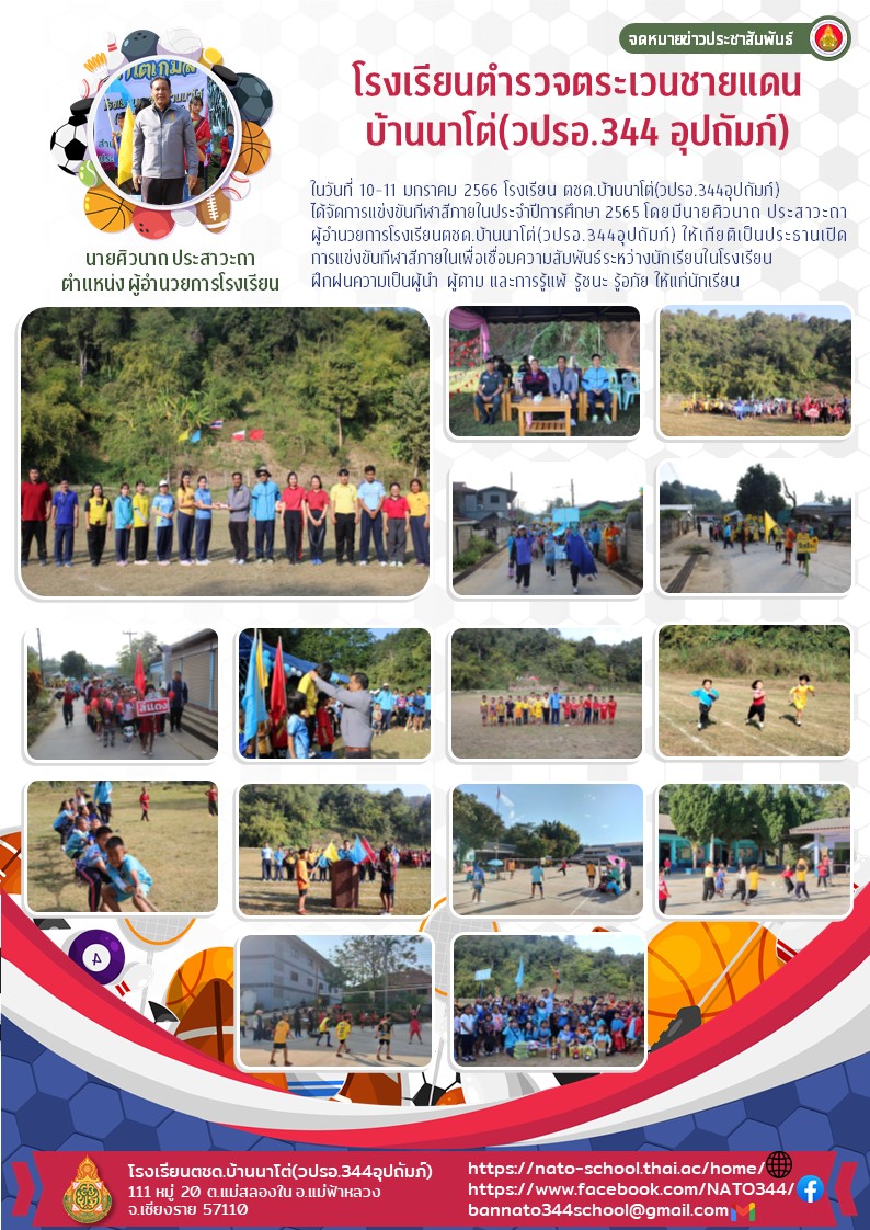 ได้จัดการแข่งขันกีฬาสีภายในประจำปีการศึกษา 2565 โดยมีนายศิวนาถ ประสาวะถา ผู้อำนวยการโรงเรียนตชด.บ้านนาโต่(วปรอ.344อุปถัมภ์) ให้เกียติเป็นประธานเปิดการแข่งขันกีฬาสีภายในเพื่อเชื่อมความสัมพันธ์ระหว่างนักเรียนในโรงเรียน