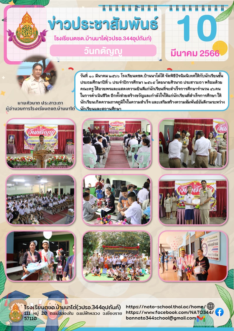 วันที่ 10 มีนาคม ๒๕๖6 โรงเรียนตชด.บ้านนาโต่ได้ จัดพิธีปัจฉิมนิเทศให้กับนักเรียนชั้นประถมศึกษาปีที่ ๖ ประจำปีการศึกษา ๒๕๖5 โดยนายศิวนาถ ประสาวะถา พร้อมด้วยคณะครู ได้อวยพรและแสดงความยินดีแก่นักเรียนที่จะสำเร็จการศึกษาจำนวน 46คน