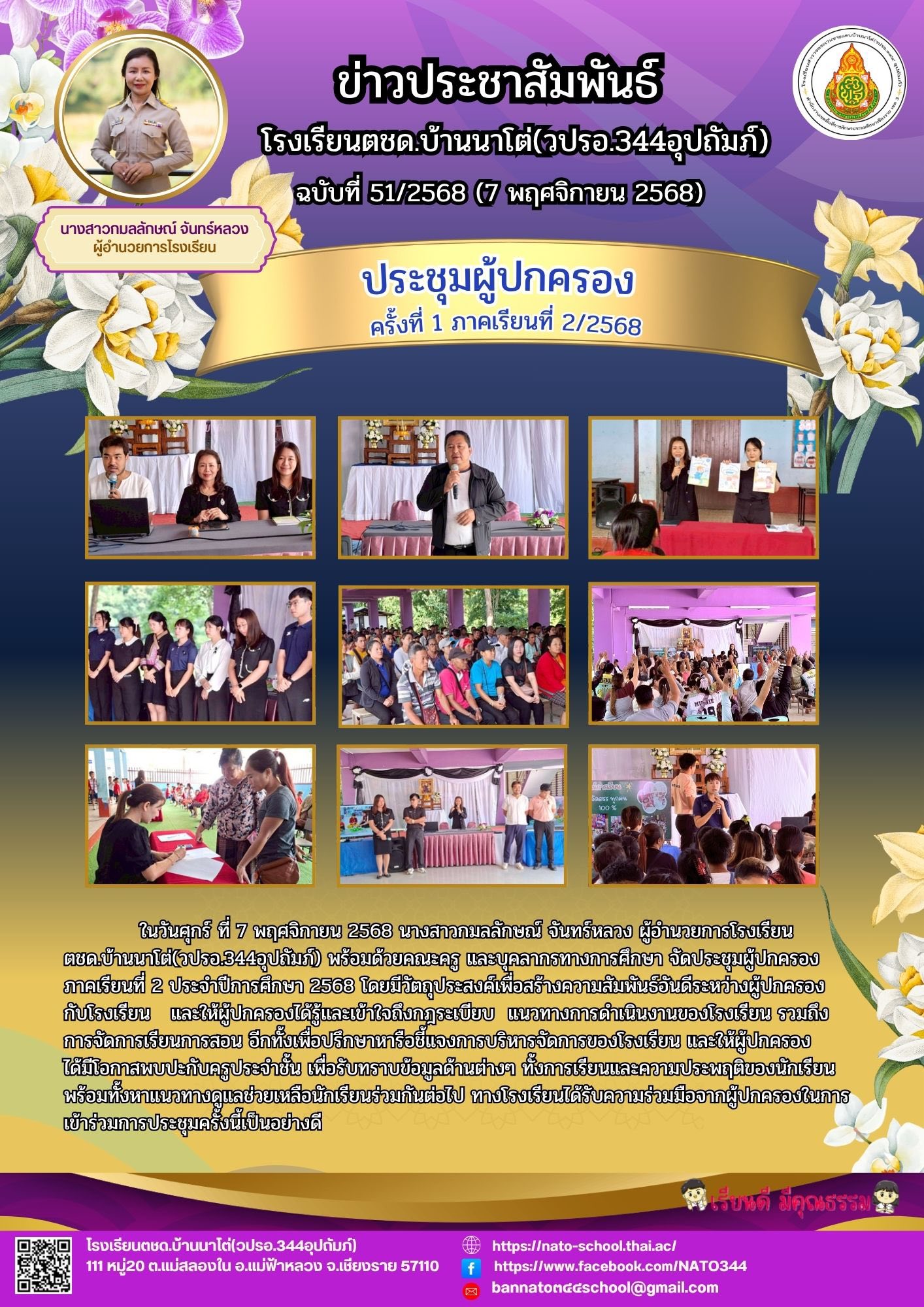 ในวันศุกร์ ที่ 7 พฤศจิกายน 2568 นางสาวกมลลักษณ์ จันทร์หลวง ผู้อำนวยการโรงเรียนตชด.บ้านนาโต่(วปรอ.344อุปถัมภ์) พร้อมด้วยคณะครู และบุคลากรทางการศึกษา จัดประชุมผู้ปกครอง ภาคเรียนที่ 2 ประจำปีการศึกษา 2568 โดยมีวัตถุประสงค์เพื่อสร้างความสัมพันธ์อันดีระหว่างผู้ปกครองกับโรงเรียนและให้ผู้ปกครองได้รู้และเข้าใจถึงกฎระเบียบ แนวทางการดำเนินงานของโรงเรียน รวมถึงการจัดการเรียนการสอน อีกทั้งเพื่อปรึกษาหารือชี้แจงการบริหารจัดการของโรงเรียน และให้ผู้ปกครองได้มีโอกาสพบปะกับครูประจำชั้น เพื่อรับทราบข้อมูลด้านต่างๆ ทั้งการเรียนและความประพฤติของนักเรียนพร้อมทั้งหาแนวทางดูแลช่วยเหลือนักเรียนร่วมกันต่อไป ทางโรงเรียนได้รับความร่วมมือจากผู้ปกครองในการเข้าร่วมการประชุมครั้งนี้เป็นอย่างดี